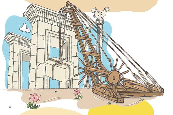 حالا یک سؤال فنّی دیگر! اگر گفتید این سنگهای بزرگ را چطور روی ستونها گذاشتهاند؟ حتماً میگویید با جرثقیل. ولی مگر آن موقعها جرثقیل وجود داشته است؟ بله! ولی یک مدل دیگر! میخواهم شما را با پدر جرثقیلهای امروزی آشنا کنم. آمادهاید؟ پس این شما و این هم «شادوف»!