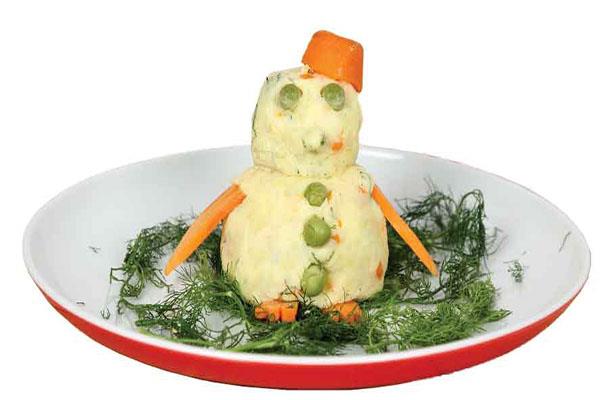 6. با نخود سبز و هویج برایش بال، پا، دکمه، چشم و کلاه درست کن.