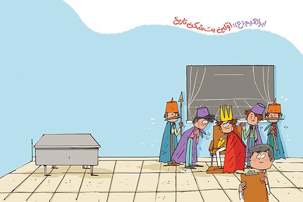 راوی [رو به تماشاچیان و پشت به صحنه ایستاده است] : نمرود پادشاه ظالم و بُتپرستی بود که مردم را به پرستیدن خود و بتهای ساختهشده از چوب و سنگ مجبور میکرد. در همان زمان، حضرت ابراهیم(ع)، اوّلین بتشکن تاریخ، یک روز که همهی مردم برای جشن از شهر خارج شده بودند، با هدف آگاهکردن مردم و نمرود، همهی بُتهای بتخانه، به جز بُت بزرگ، را شکست و تبر را روی دوش آن بت گذاشت. او در پاسخ به مردم که پرسیدند: آیا تو بتها را شکستهای؟ گفت: شاید هم بت بزرگ این کار را کرده باشد! اگر بتها سخن میگویند، بروید از آنها بپرسید.